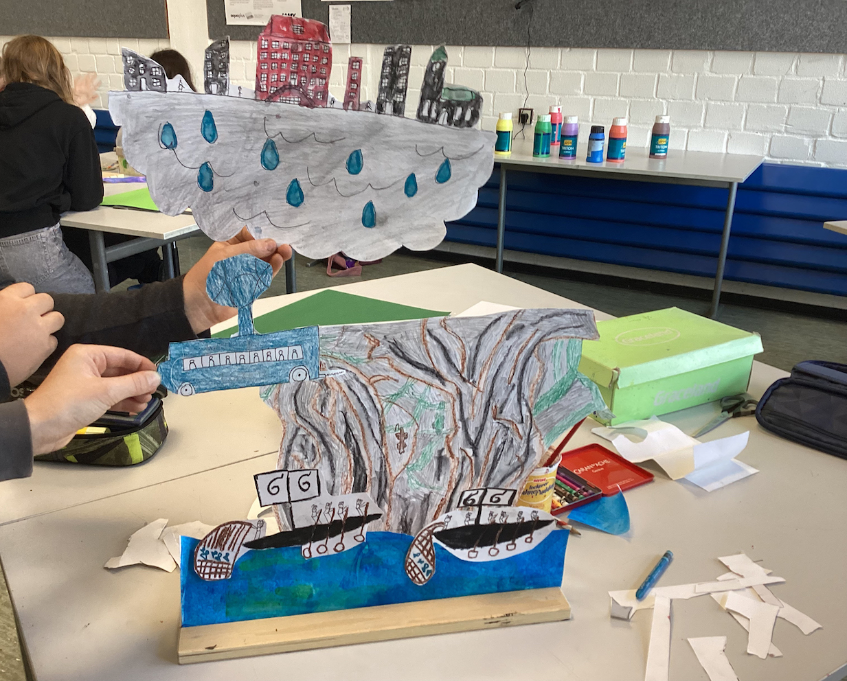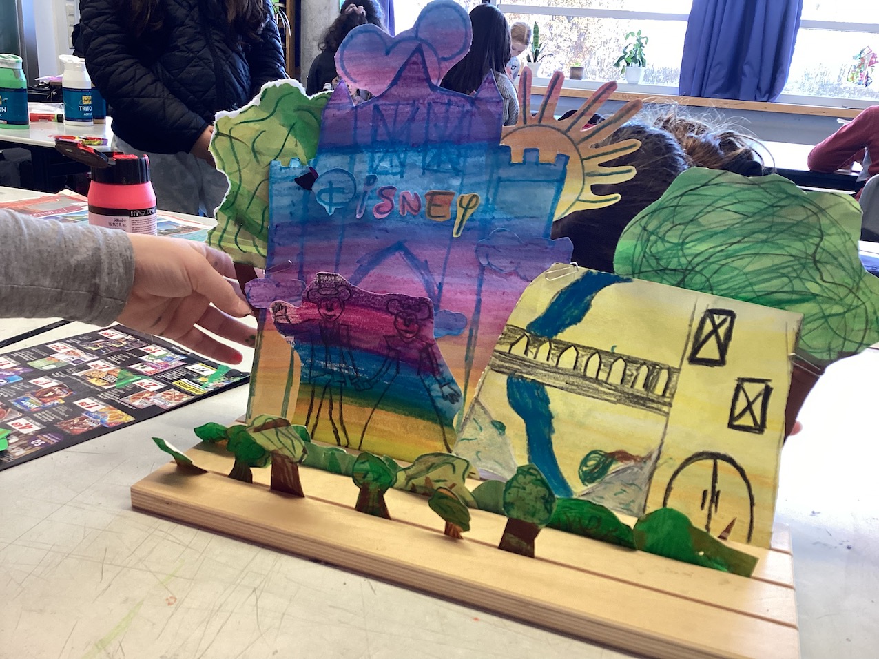 Anschließend bildeten sich kleinere Gruppen, die sich mit der Erstellung eines gemeinsamen Masterplans beschäftigten und einigten sich auf eine Welt, die sie gemeinsam gestalten möchten. Nach einer kurzen Technikeinführung (Acryl mit Spachtel und Aquarellkreiden) haben die Teilnehmenden in Gruppen Elemente ihrer Welt auf Papier gestaltet und auf Erzählschienen angeordnet und präsentiert. Diese Elemente wurden dann mit dem Ipad eingescannt. Nach der Präsentation der utopischen und dystopischen Welten erhielten die entstandenen Bühnenbilder eigene Titel.